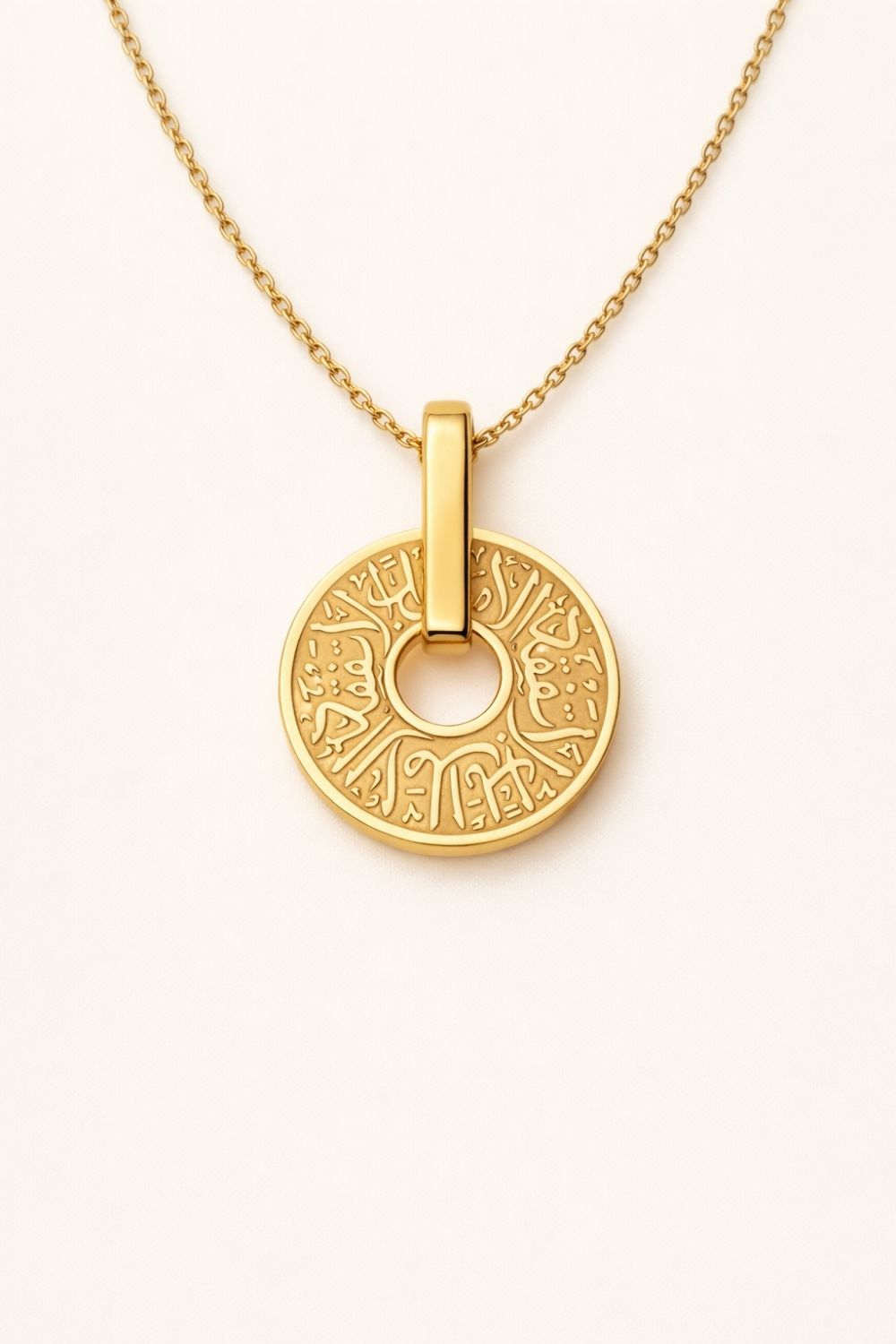 Made from high-quality stainless steel with a radiant gold finish, this necklace combines elegance with durability. Its minimalist circular design and refined Arabic calligraphy create a timeless piece that can be worn every day.