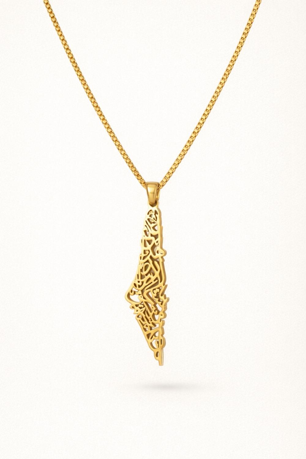 A powerful symbol of identity, resilience, and heritage. The Palestine Necklace features a beautifully crafted pendant shaped like the map of Palestine, filled with intricate Arabic calligraphy that celebrates culture, faith, and belonging.