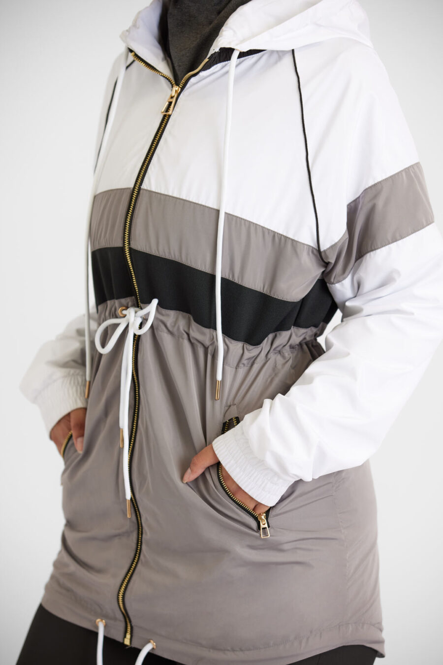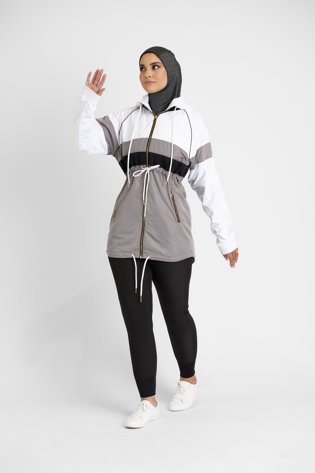 Featuring a generous hood, elasticated cuffs, and functional drawcords at the hood and hem, with gold hardware throughout for a high-quality finish. This jacket is sure to keep you warm and comfortable no matter where your adventures take you. It’s also perfect for layering, coordinate with our Black Fitness Tights for a complete look. Whether you’re headed to the gym or out for a hike, our Essential Windbreaker Jacket is a perfect choice.