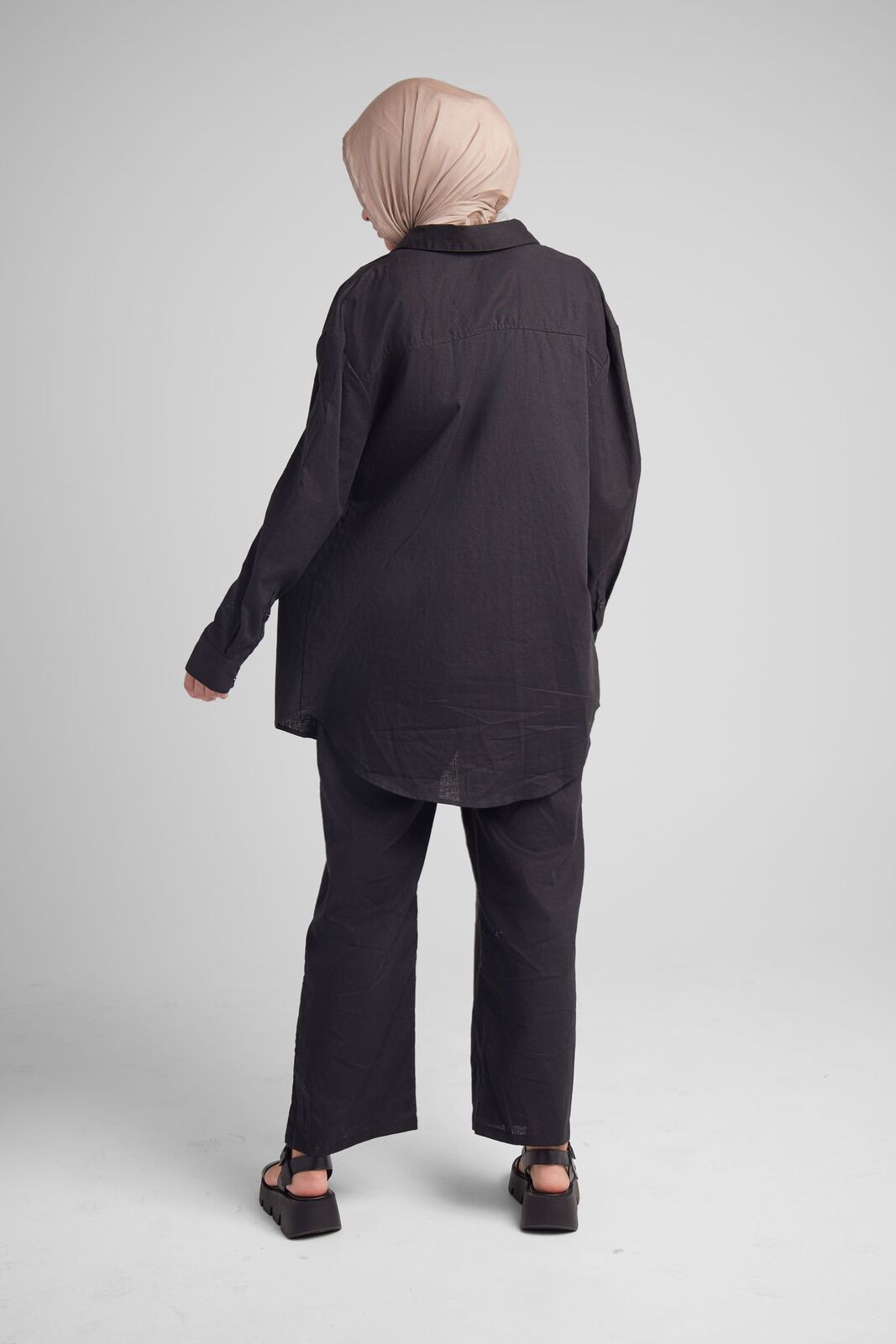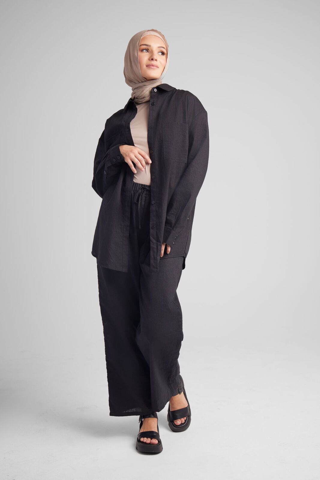 Getting ready is a breeze with the Black Oversized Linen Shirt, a must-have classic that simplifies your daily wardrobe decisions. This piece is the epitome of timeless versatility, offering a relaxed fit that can be worn loose, tucked in, or open over a layer for varied styling options. The non-sheer fabric ensures you stay comfortable without the need for additional layers. Featuring front pockets, a practical feature, allowing you to carry small items effortlessly. For a chic, comfy look, tap into the coordinating set trend and pair it with the matching linen pants, creating an ensemble that’s both stylish and functional.