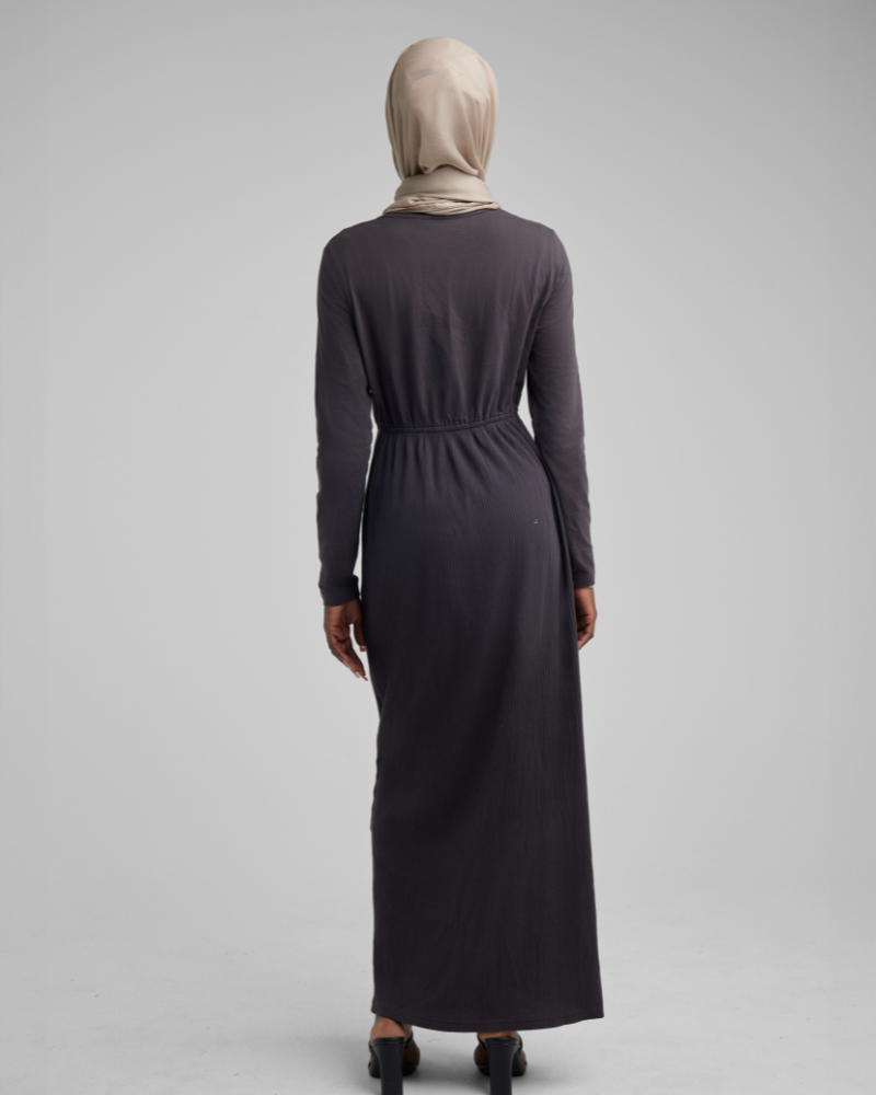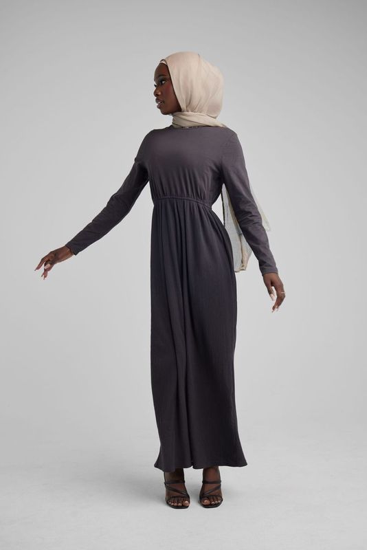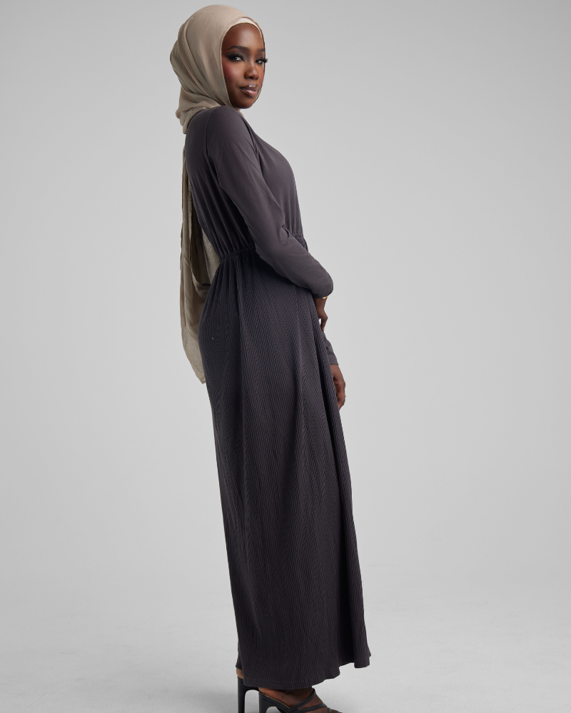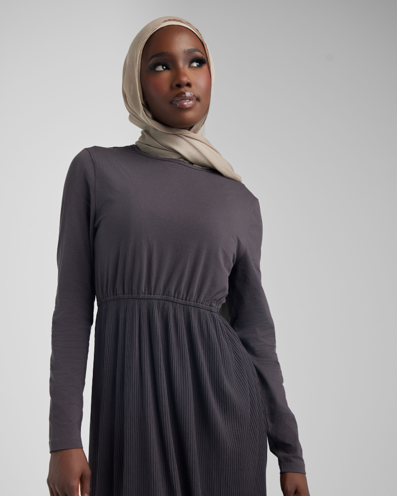 Designed for comfort and style, this classic dress features a ribbed, subtly pleated skirt and a soft cotton top with an elastic waist for a flattering, non-clingy silhouette.