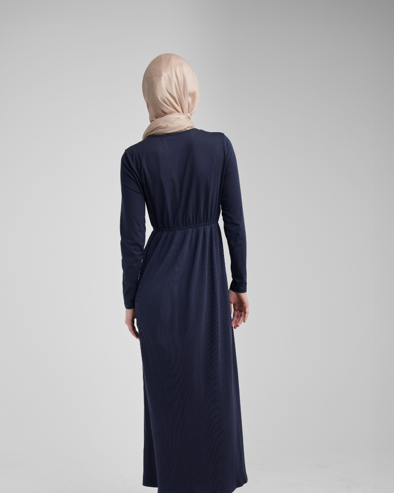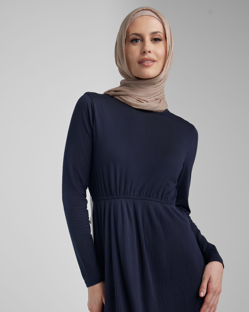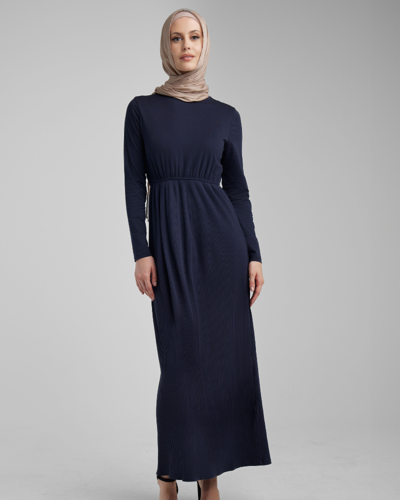 Designed for comfort and style, this classic dress features a ribbed, subtly pleated skirt and a soft cotton top with an elastic waist for a flattering, non-clingy silhouette.