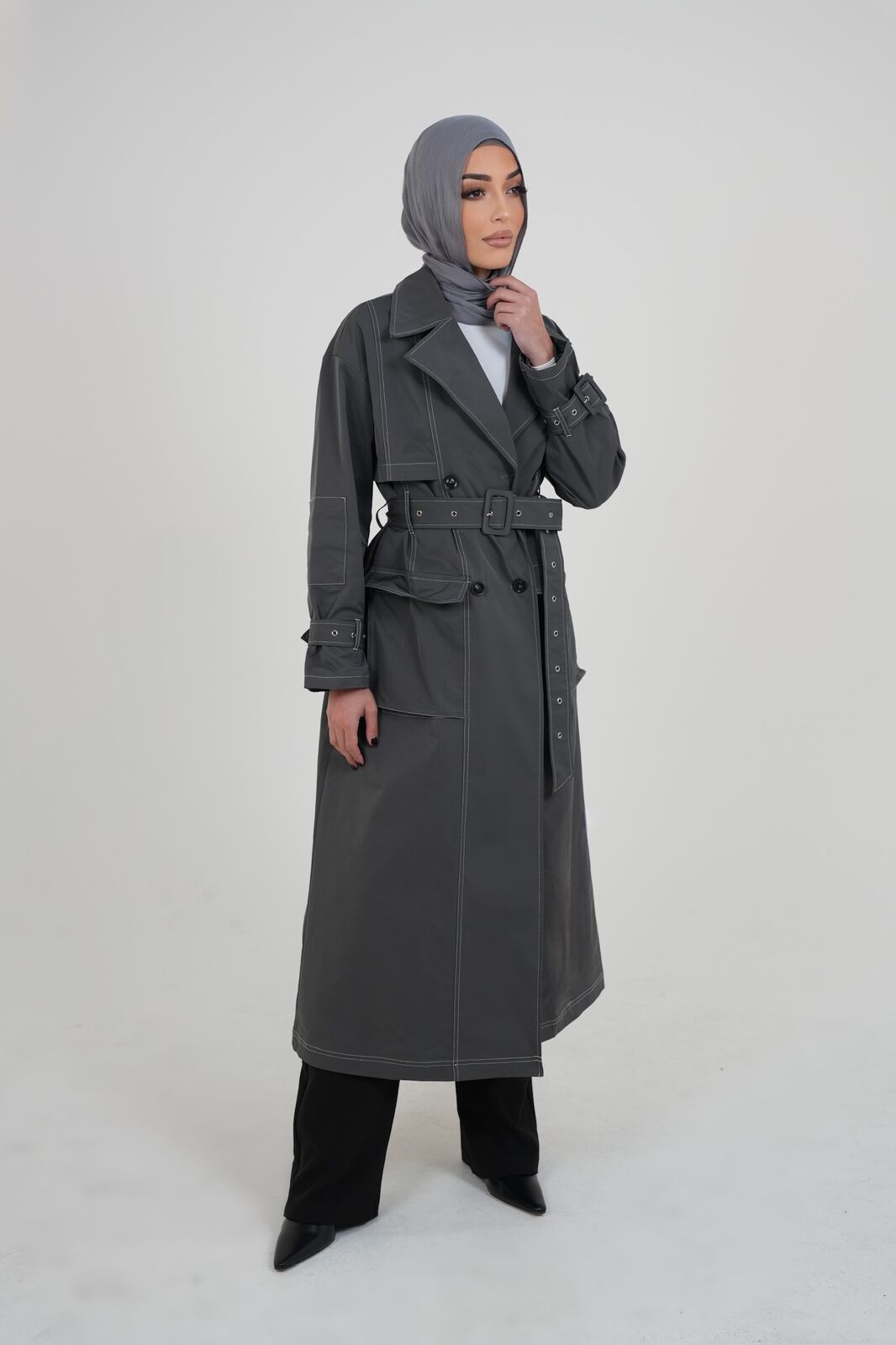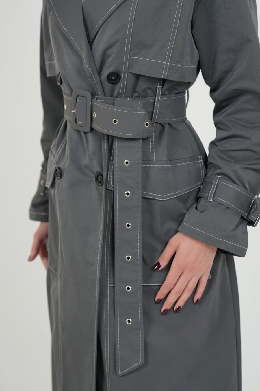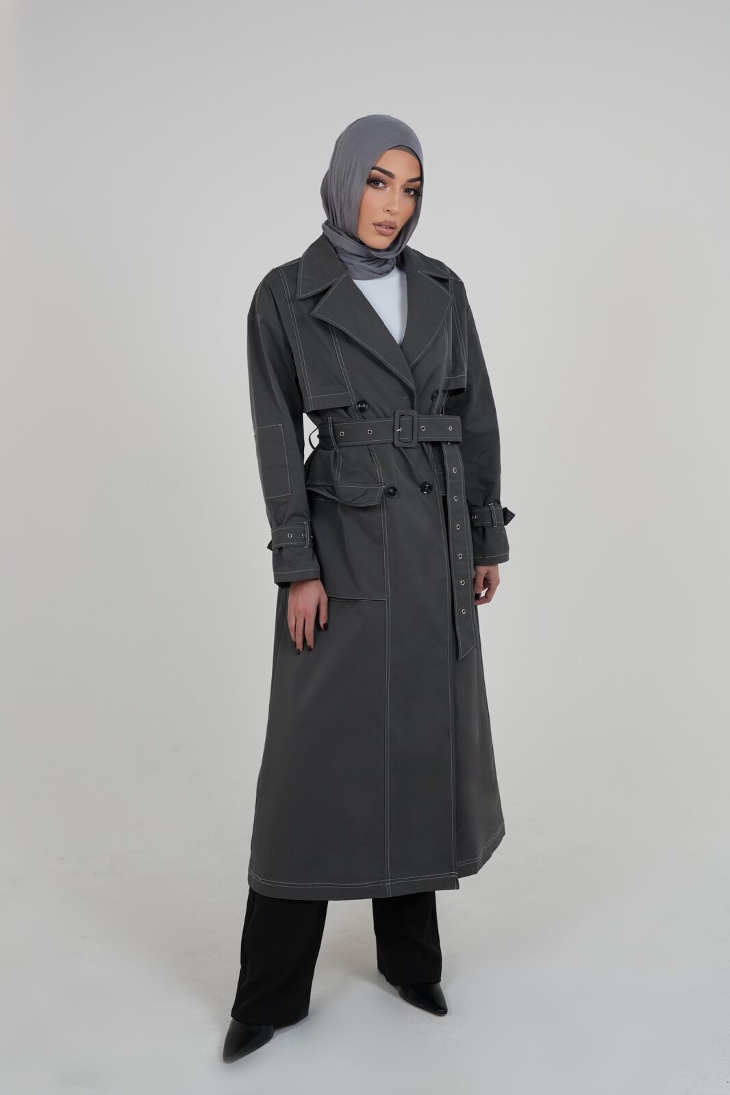 Wrap yourself in the trans-seasonal Charcoal Contrast Coat. This must-have statement trench boasts an elegant contrast stitch that weaves through the fabric. Designed for both functionality and fashion, it features a flattering adjustable waist belt that cinches to accentuate your silhouette. With practical pockets to secure your essentials. Whether paired with a sleek dress or tailored trousers, it promises to elevate any ensemble while ensuring you remain effortlessly chic. Make a lasting impression with this timeless addition to your wardrobe, where style meets substance.