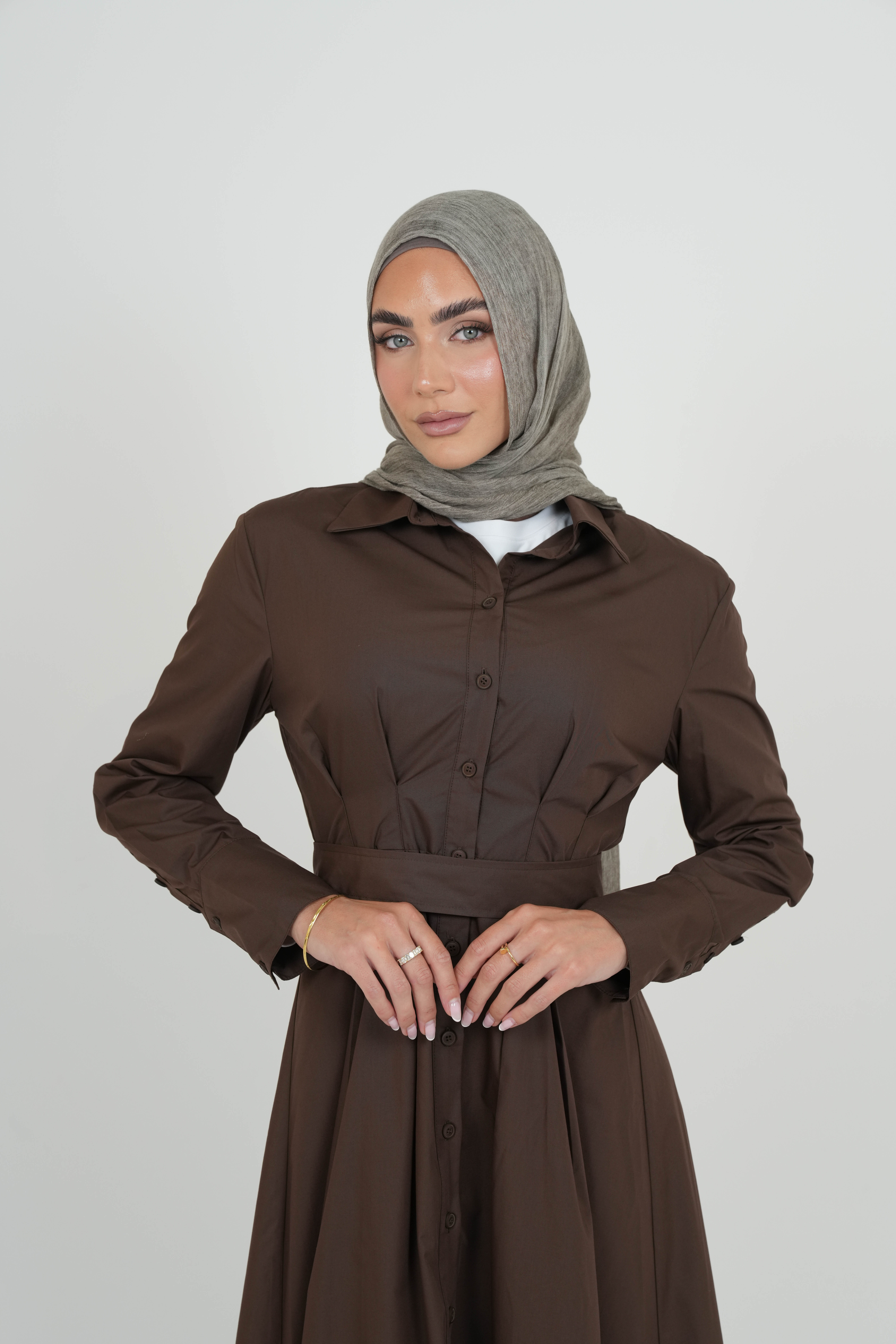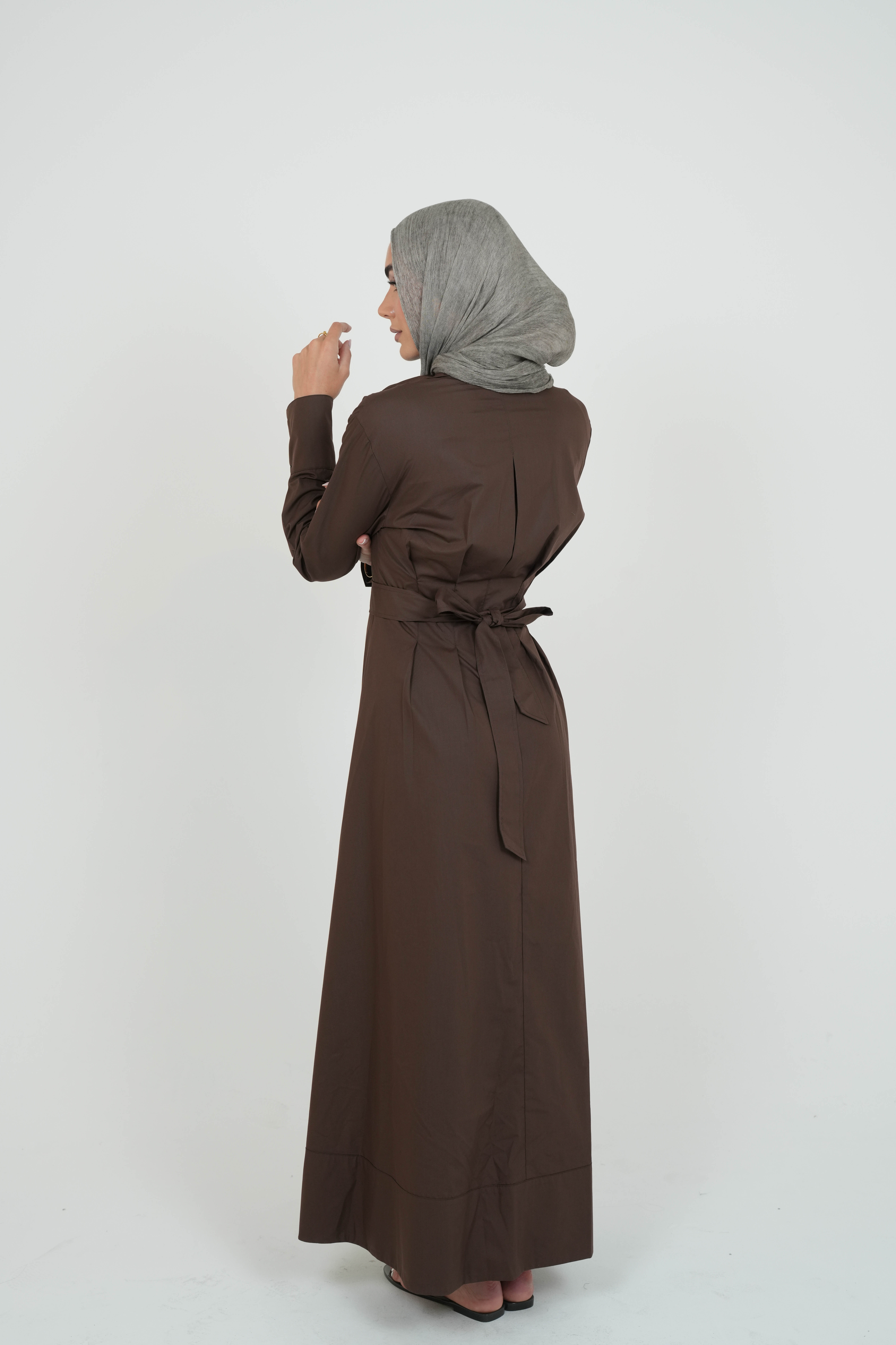 The Brown Soft Pleated Dress features soft pleats that move gracefully with every step, a pointed collar for a timeless touch, and front buttons for adjustable styling. A matching fabric belt lets you cinch the waist for a flattering silhouette or leave it relaxed for an airy, flowy feel.