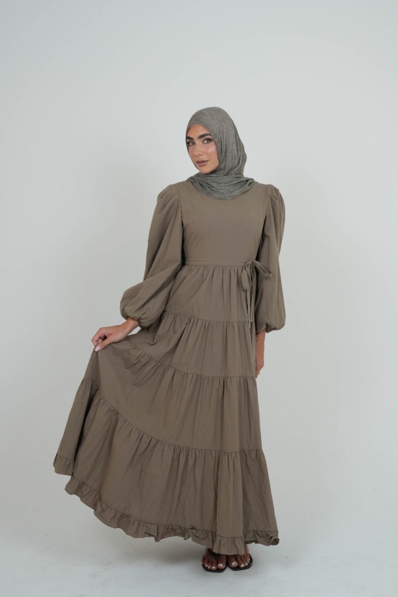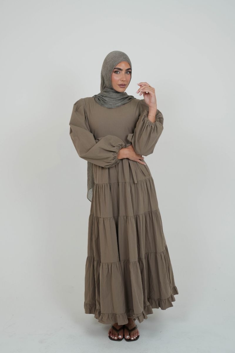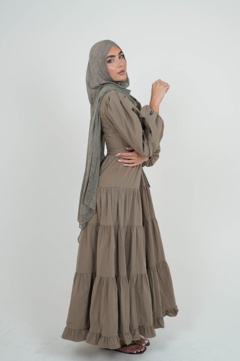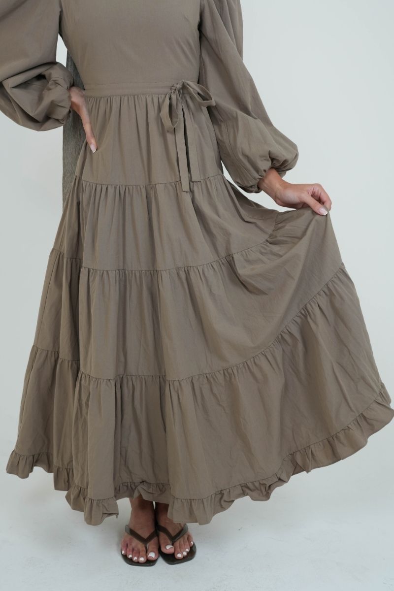 The Cedar Tiered Dress is designed in a full-length silhouette with a ruffled, tiered skirt that moves beautifully with every step. The side buttons on the chest area add a subtle, modern detail, while elastic cuff sleeves keep the fit comfortable and versatile.
