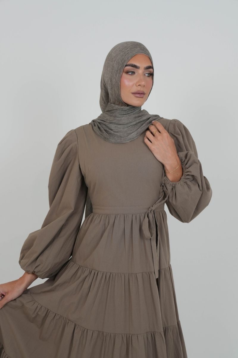 Perfect for casual days, office wear, or special occasions, this dress combines modest coverage with playful, elegant details — a wardrobe staple in a warm cedar hue.