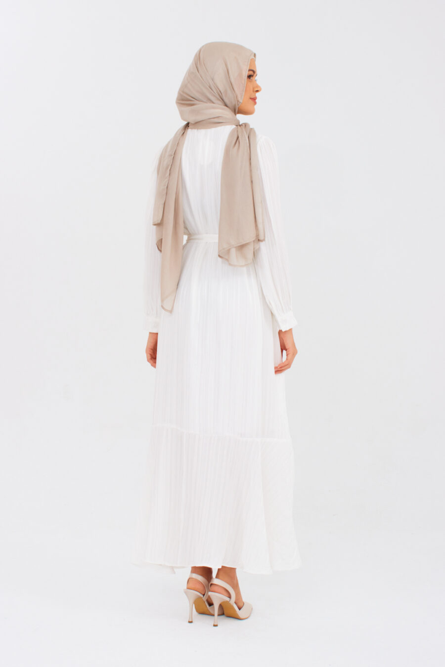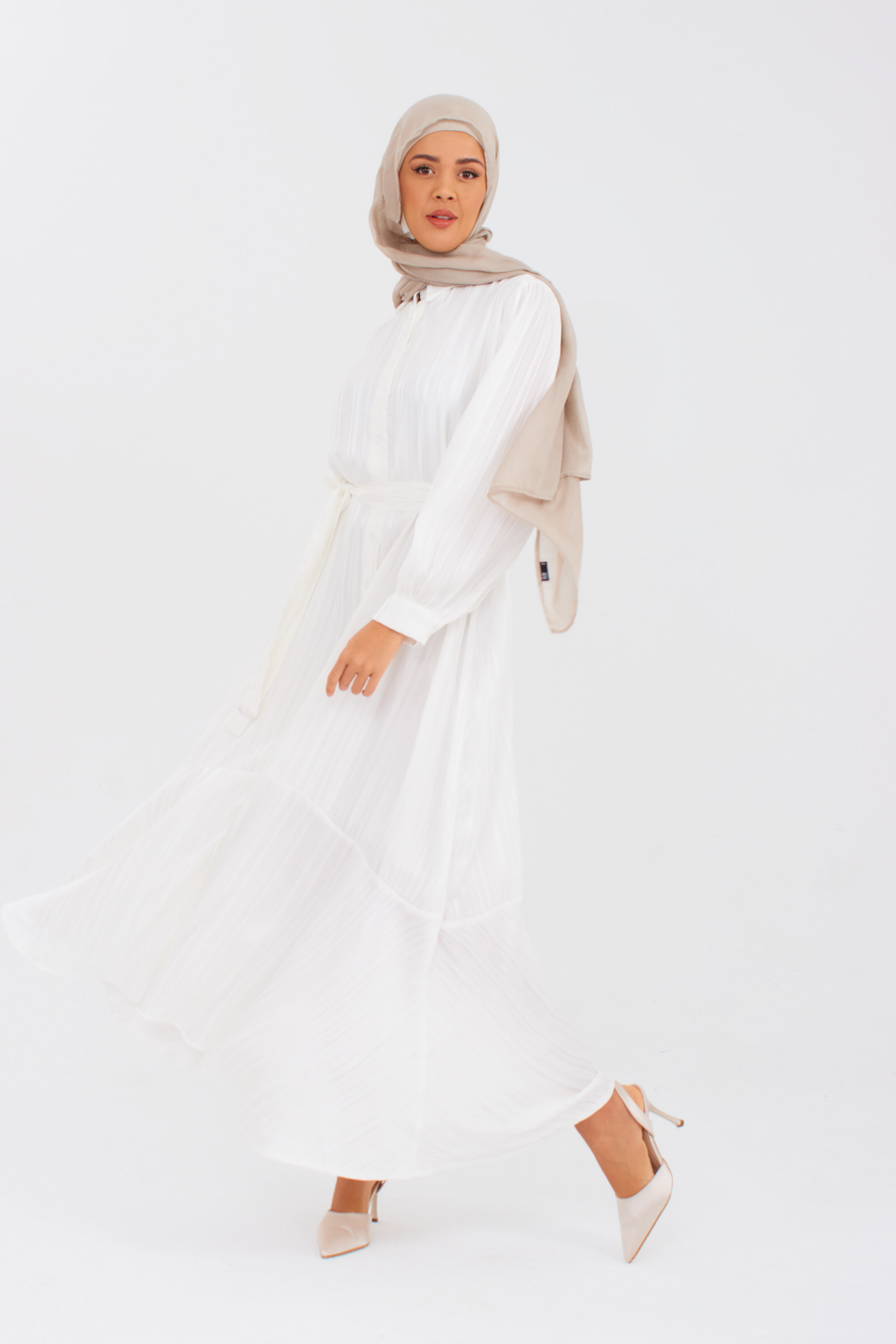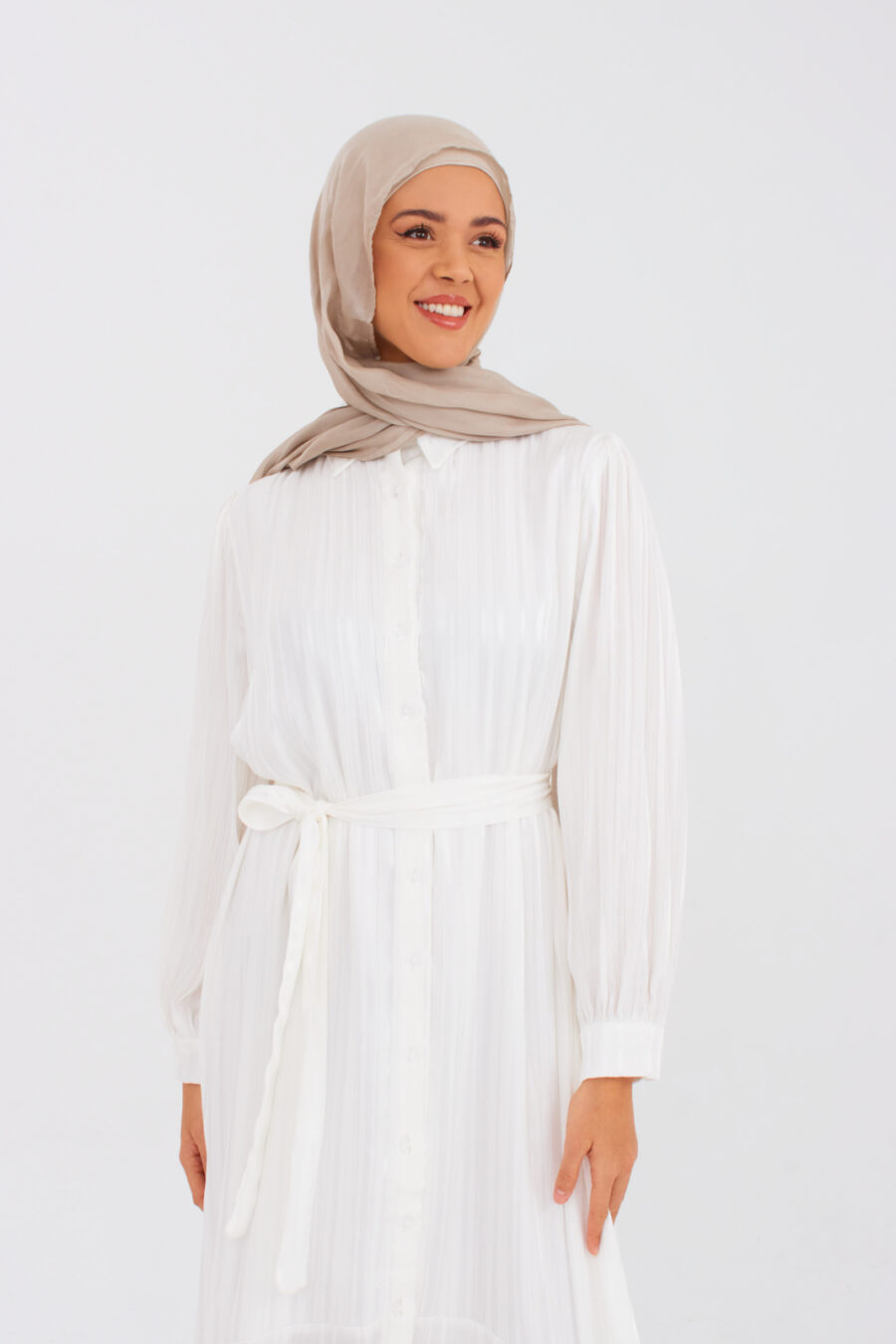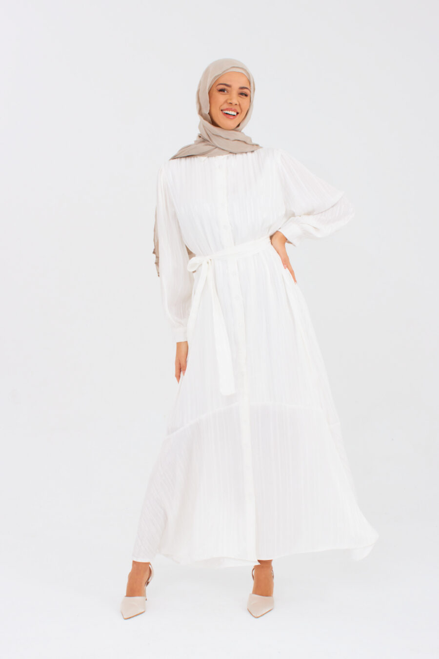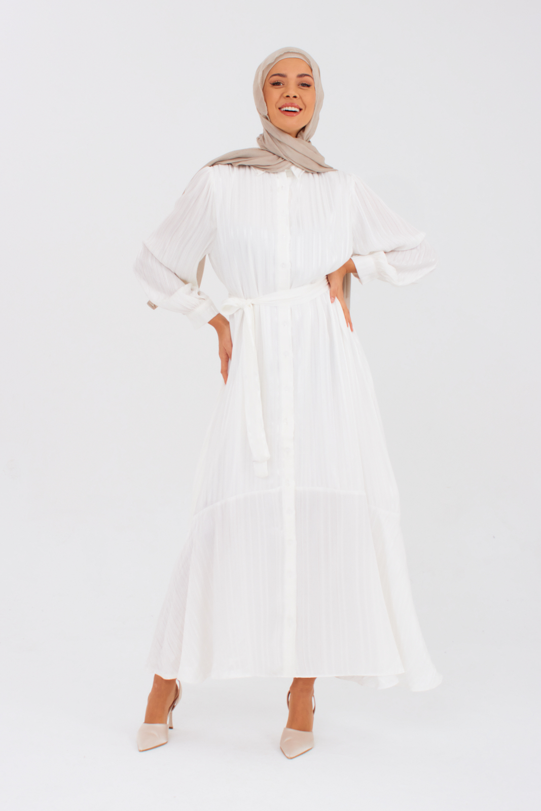 The button-down nursing dress in elegant white offers convenient access. The belted waist and A-line fit create a flattering silhouette, while blouson sleeves add versatility for any occasion. Must-have style.