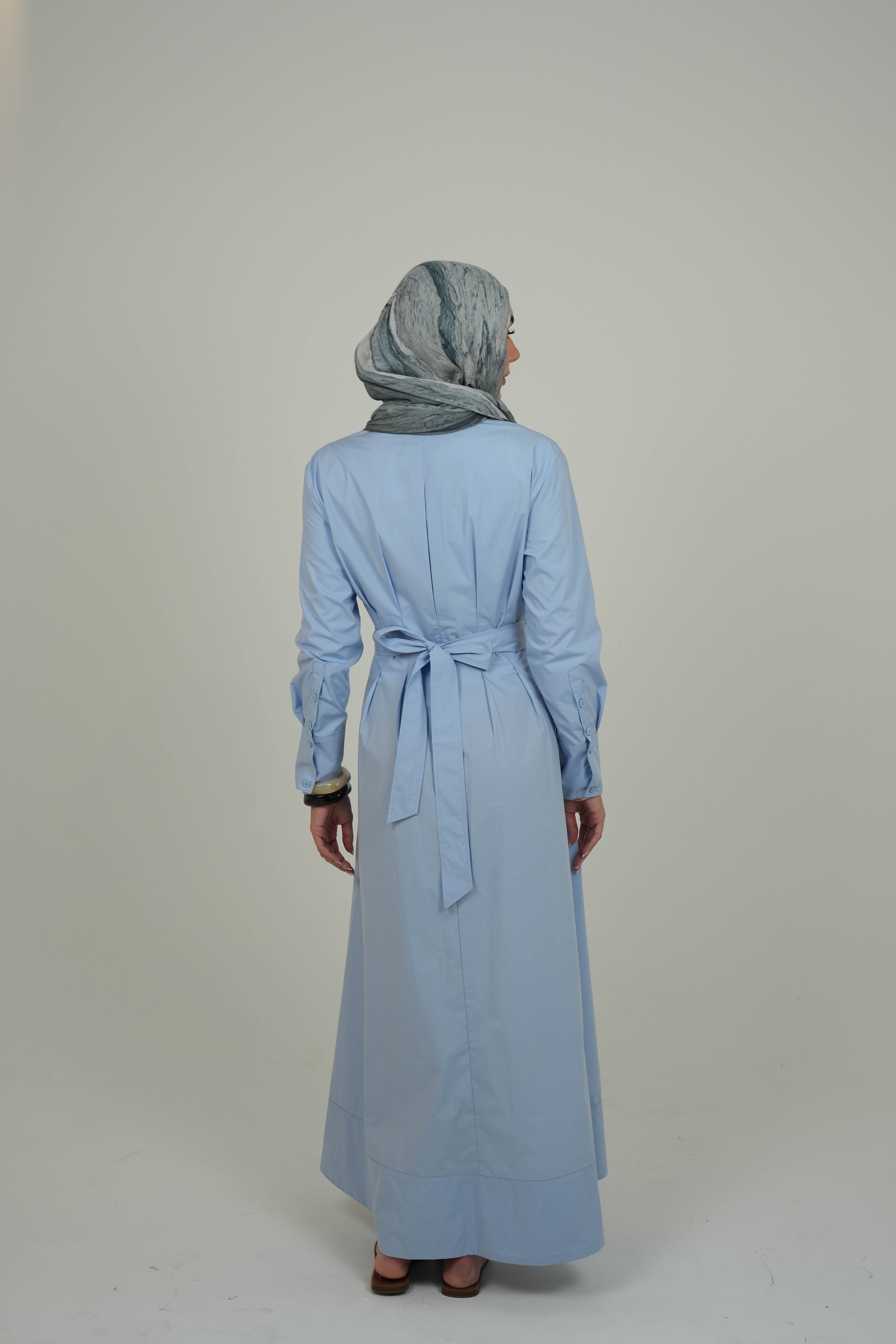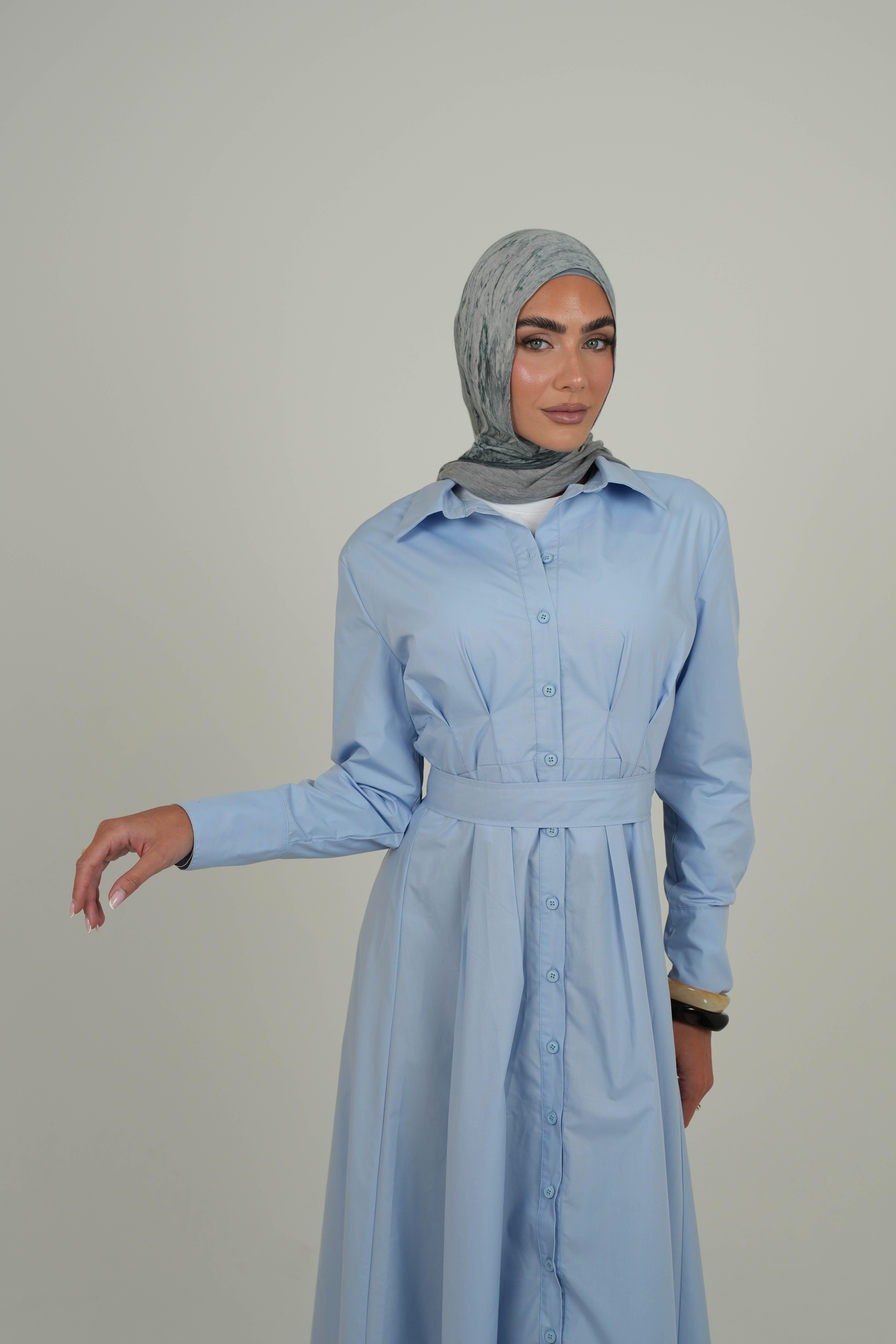 The Sky Blue Soft Pleated Dress features soft pleats that flow gracefully, a pointed collar for a classic touch, and front buttons for easy styling. A matching fabric belt lets you cinch the waist for a flattering silhouette or leave it loose for a relaxed, airy feel.
