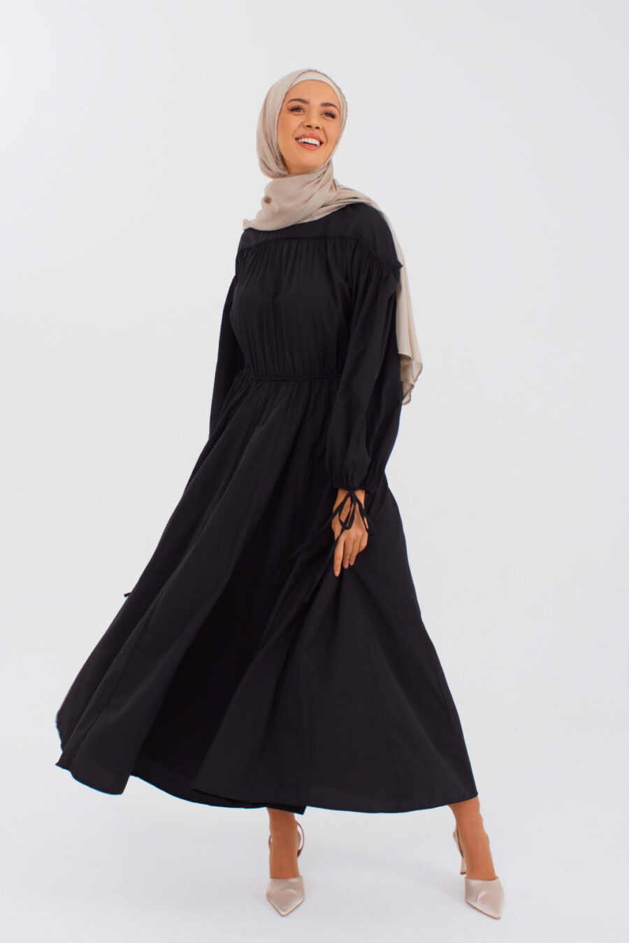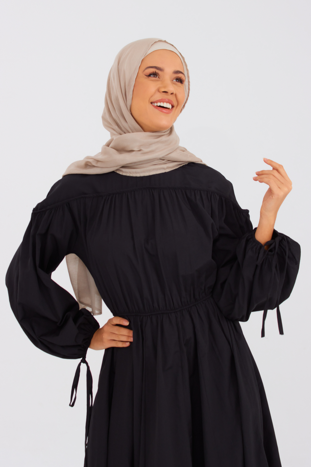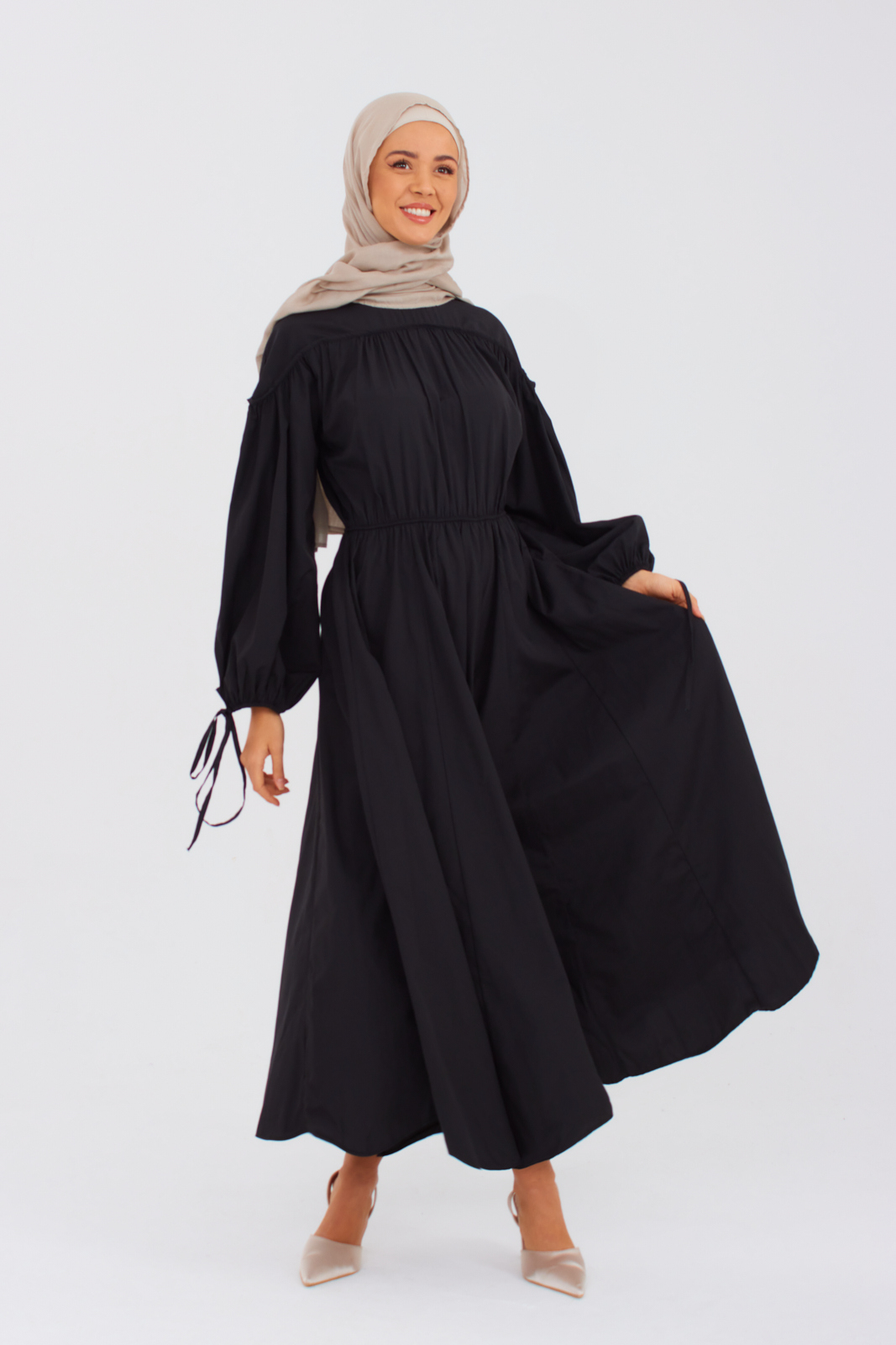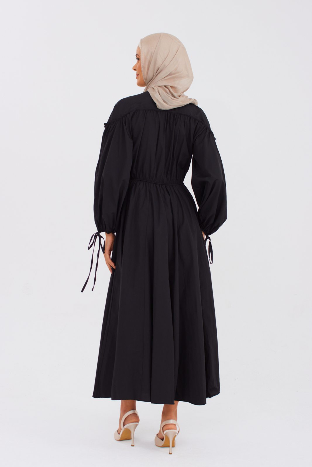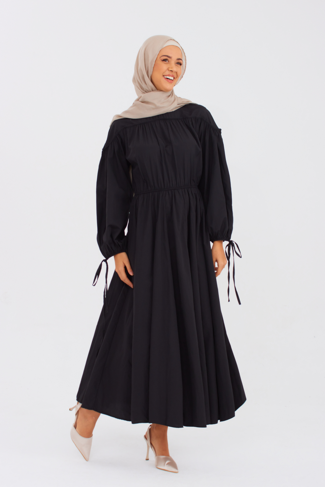 The Vantablack Dress, crafted from premium materials, blends comfort with style. Its A-line cut, cinched waist, and elegant blouson sleeves create a flattering silhouette suitable for any occasion.Available from 6 to 16