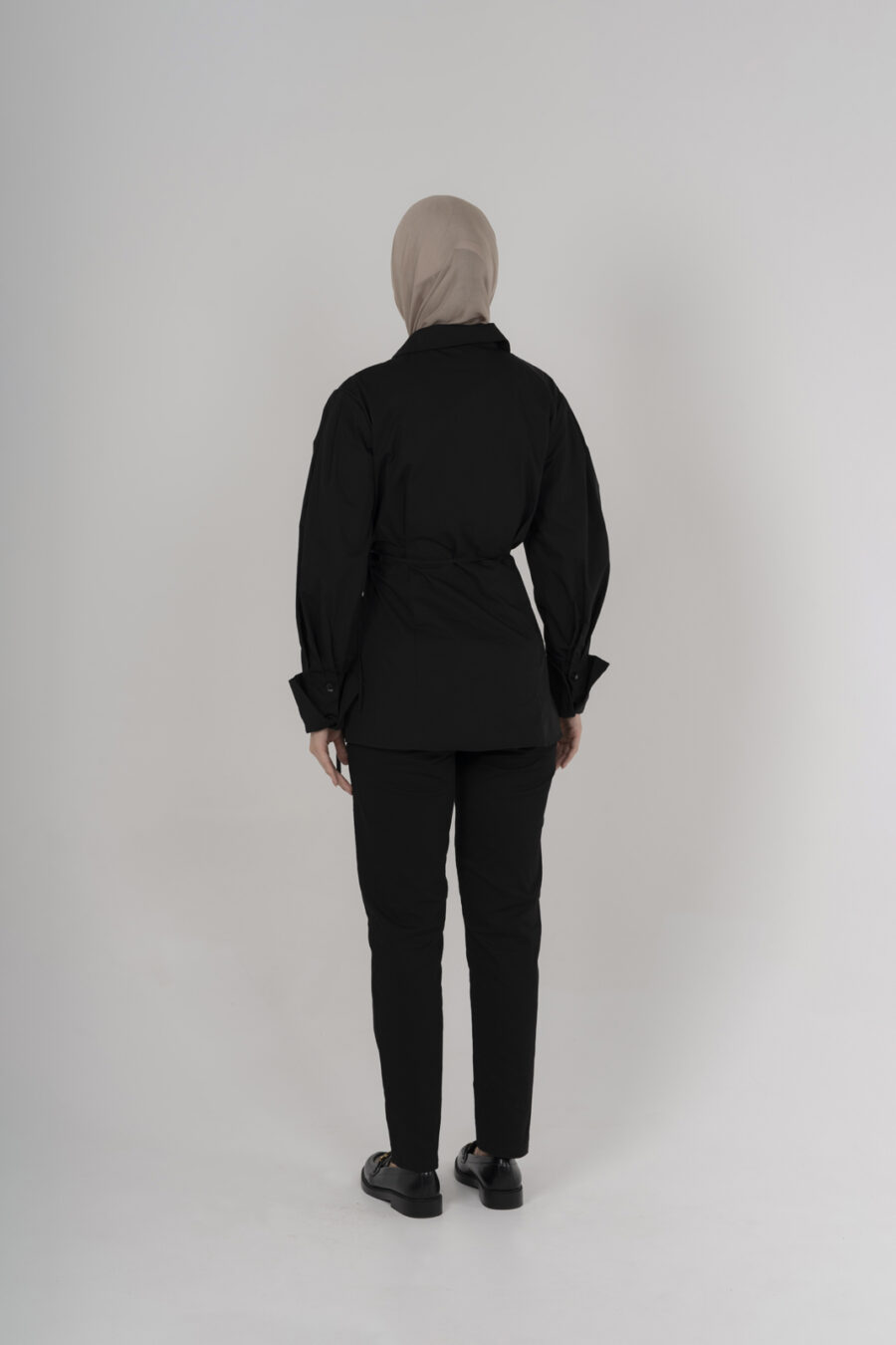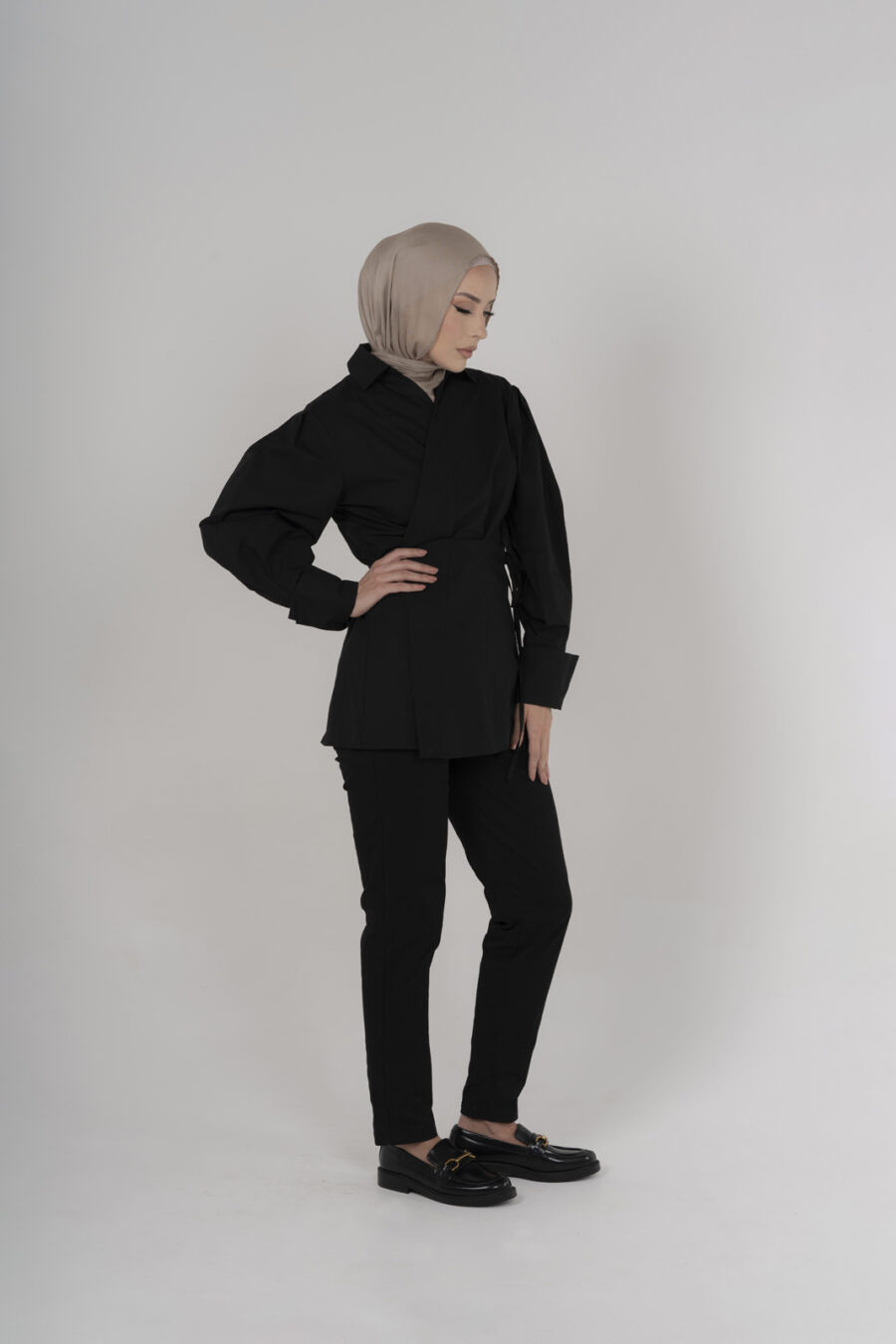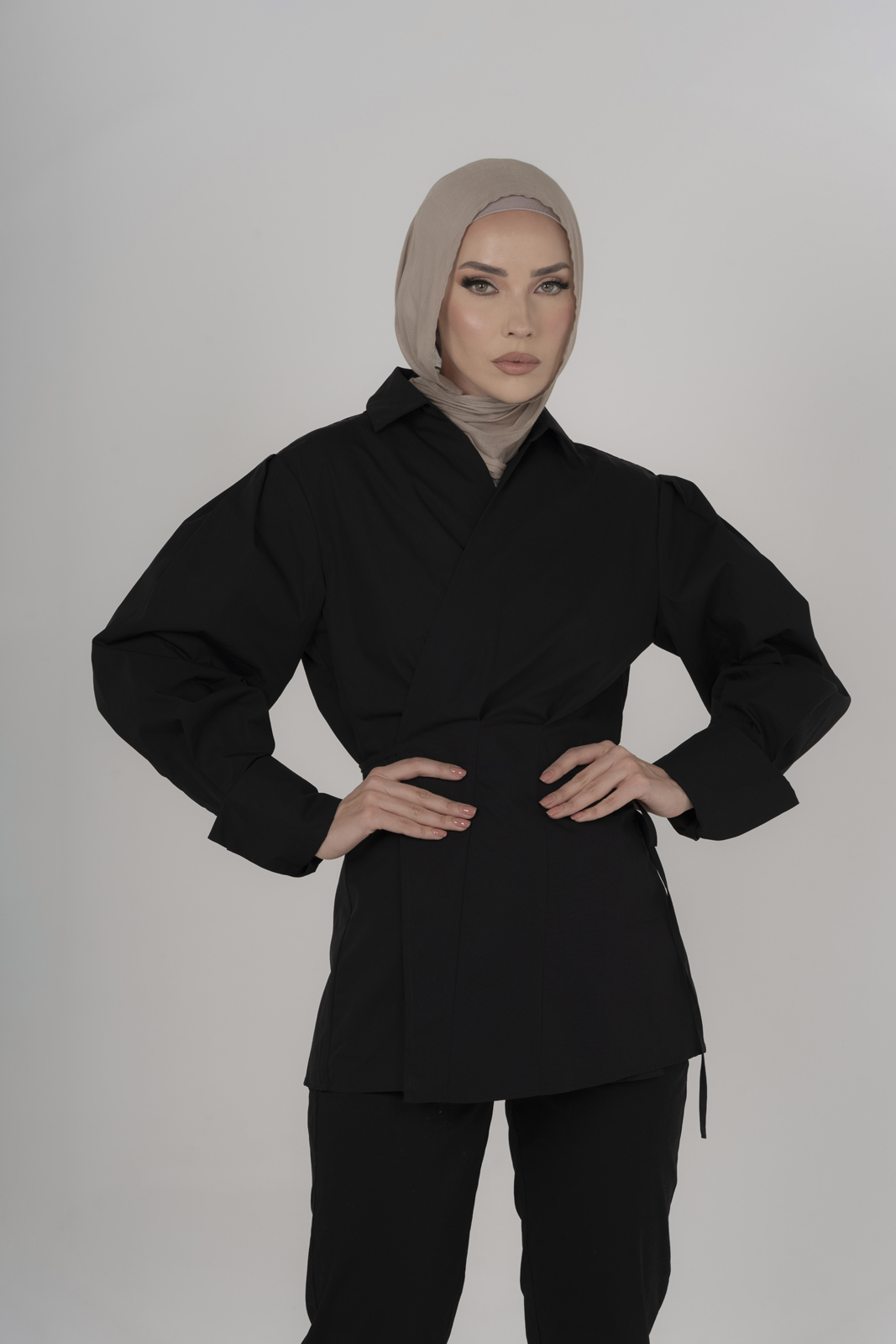 Add to your wardrobe, the new Black Collar Shirt. Designed to flatter, this shirt features an adjustable wrap style that contours to your unique silhouette, offering a personalized fit. The feminine balloon sleeves add a touch of elegance, featuring a double wrap cuff. Crafted with precision, the crisp collar adds a sharp accent to this versatile piece, perfect for both office attire and evening wear. Experience the seamless blend of comfort and style, making this black collar shirt an essential addition to your fashion repertoire.