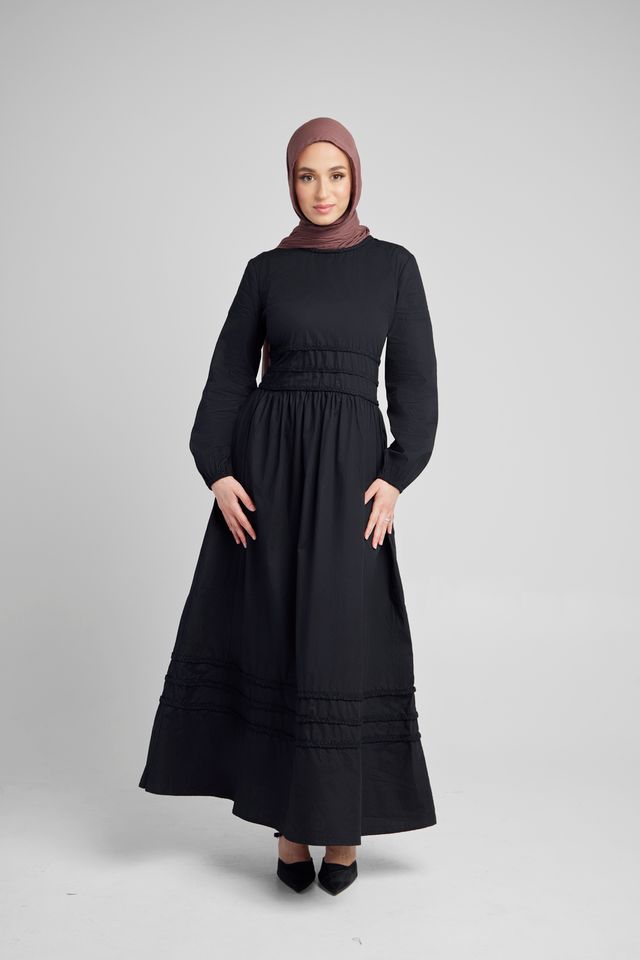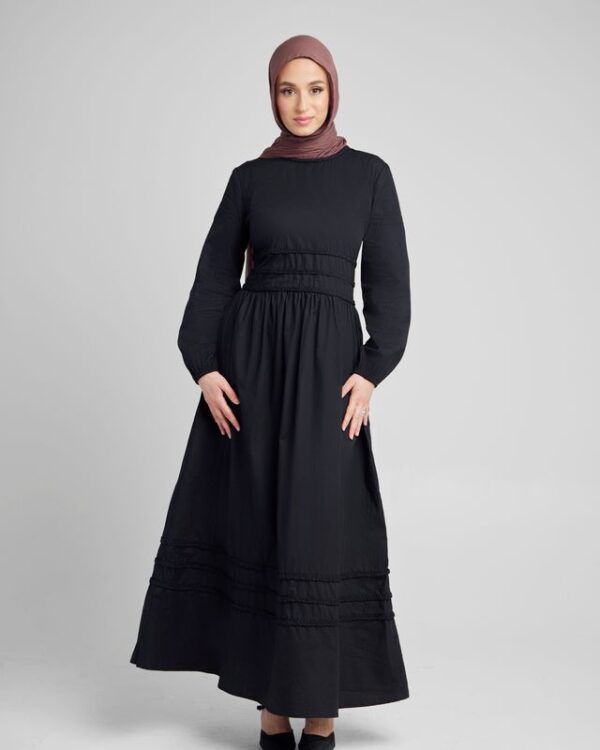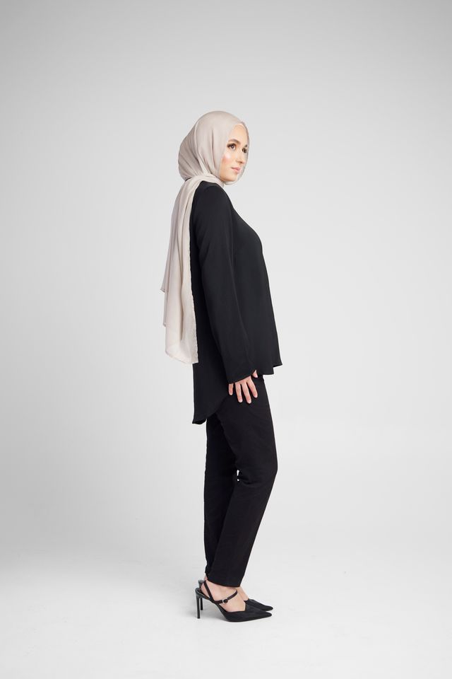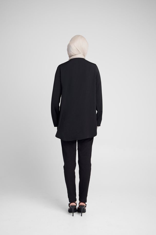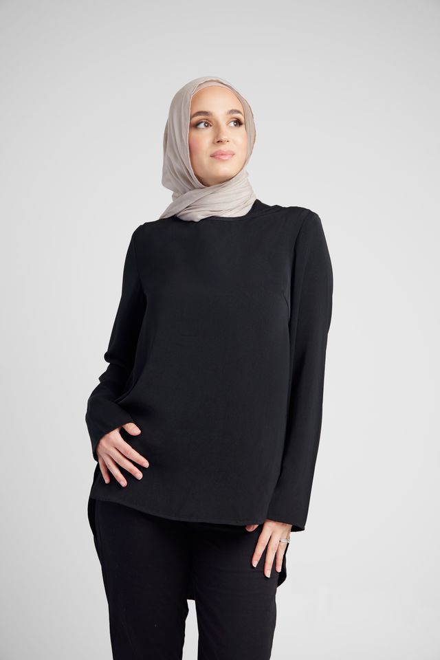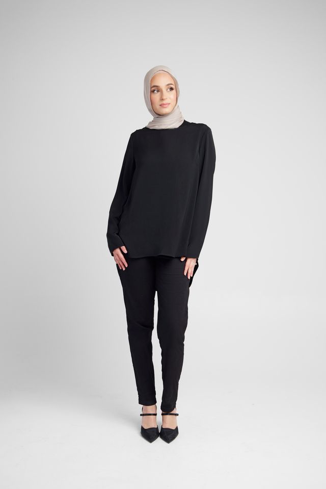 Introducing our Black Dress Top. This non-sheer, high-quality top features straight sleeves and a lower back hem, making it perfect for layering or dressing up for formal occasions.
