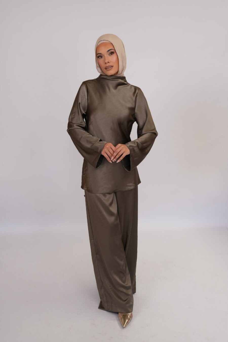 Perfectly paired with our Khaki Satin Wide-Leg Trousers for a coordinated, elegant outfit