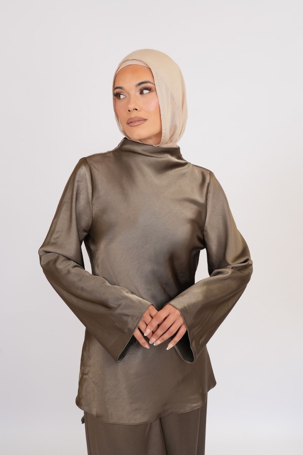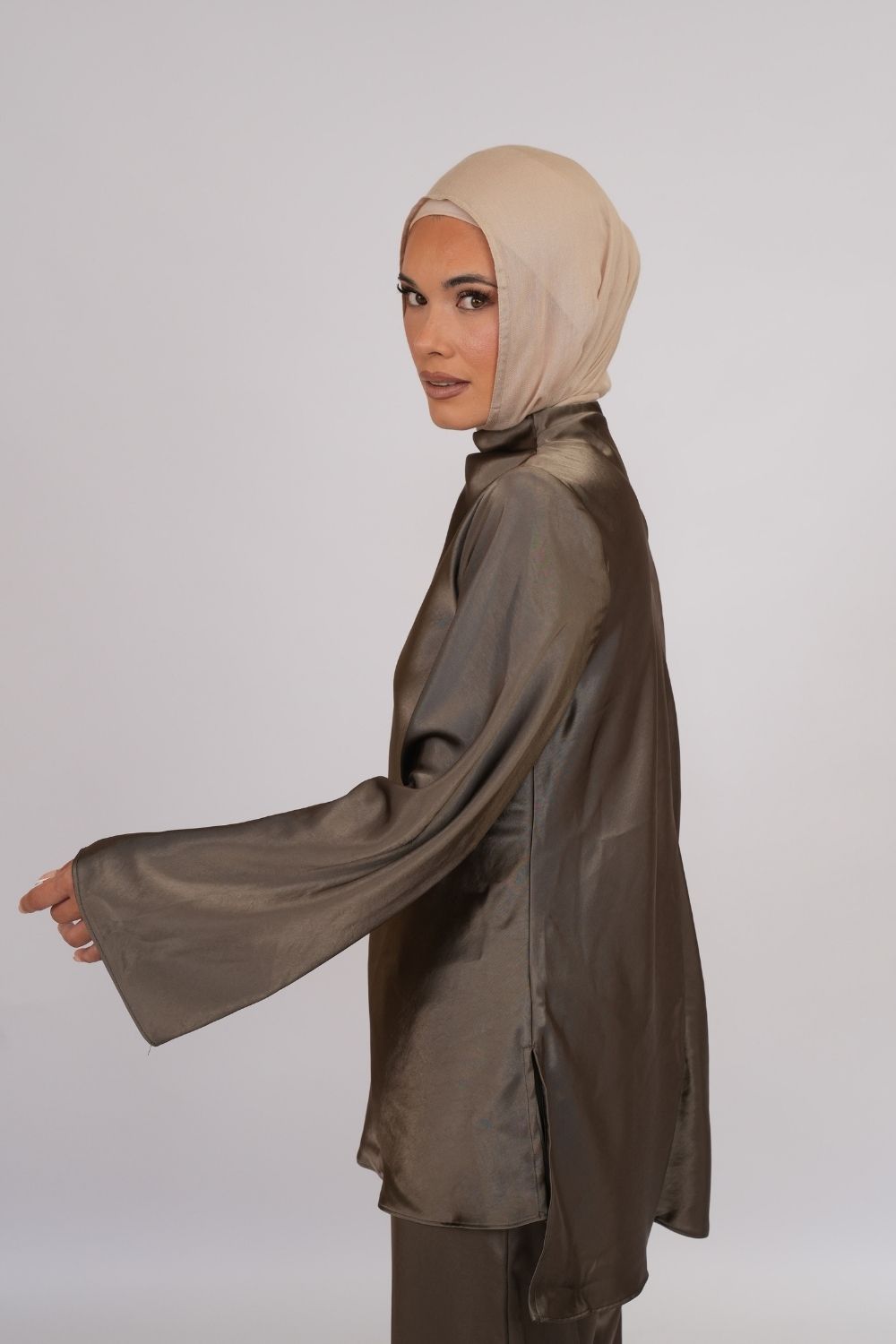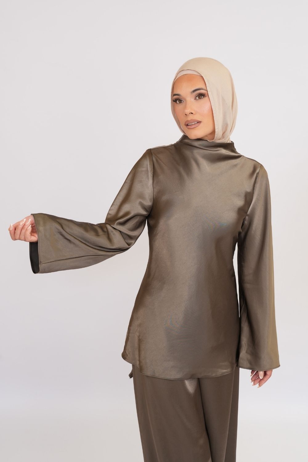 Perfectly paired with our Khaki Satin Wide-Leg Trousers for a coordinated, elegant outfit