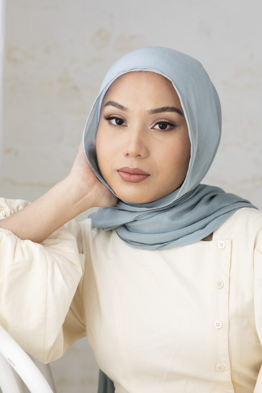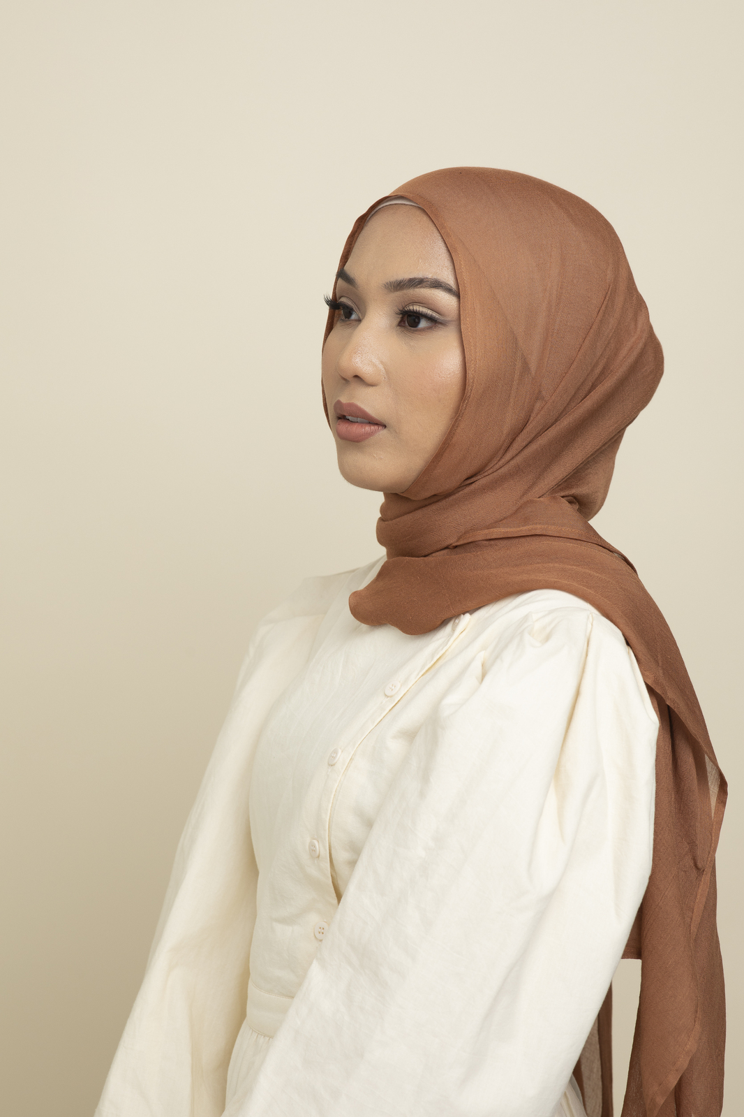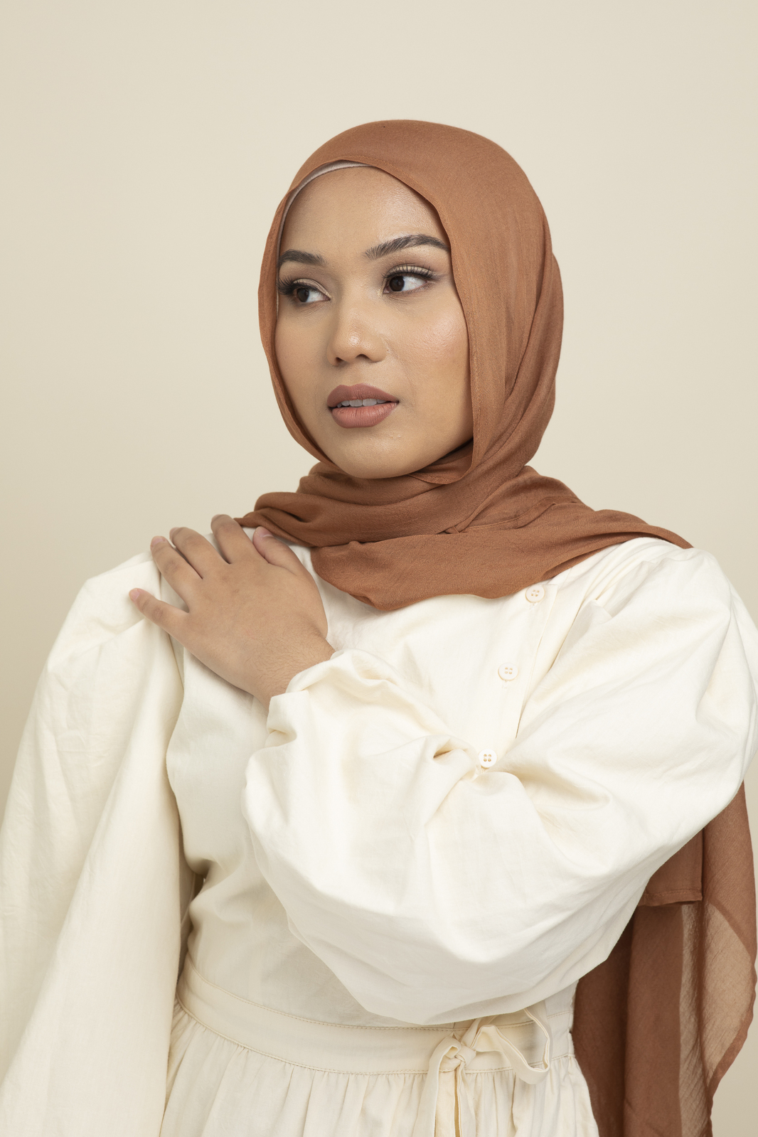 Our Modal Hijab, crafted from 100% micro modal, is soft, lightweight, and eco-friendly. Double-stitched for durability, it provides perfect coverage without heaviness. No pins needed, various colors available.
