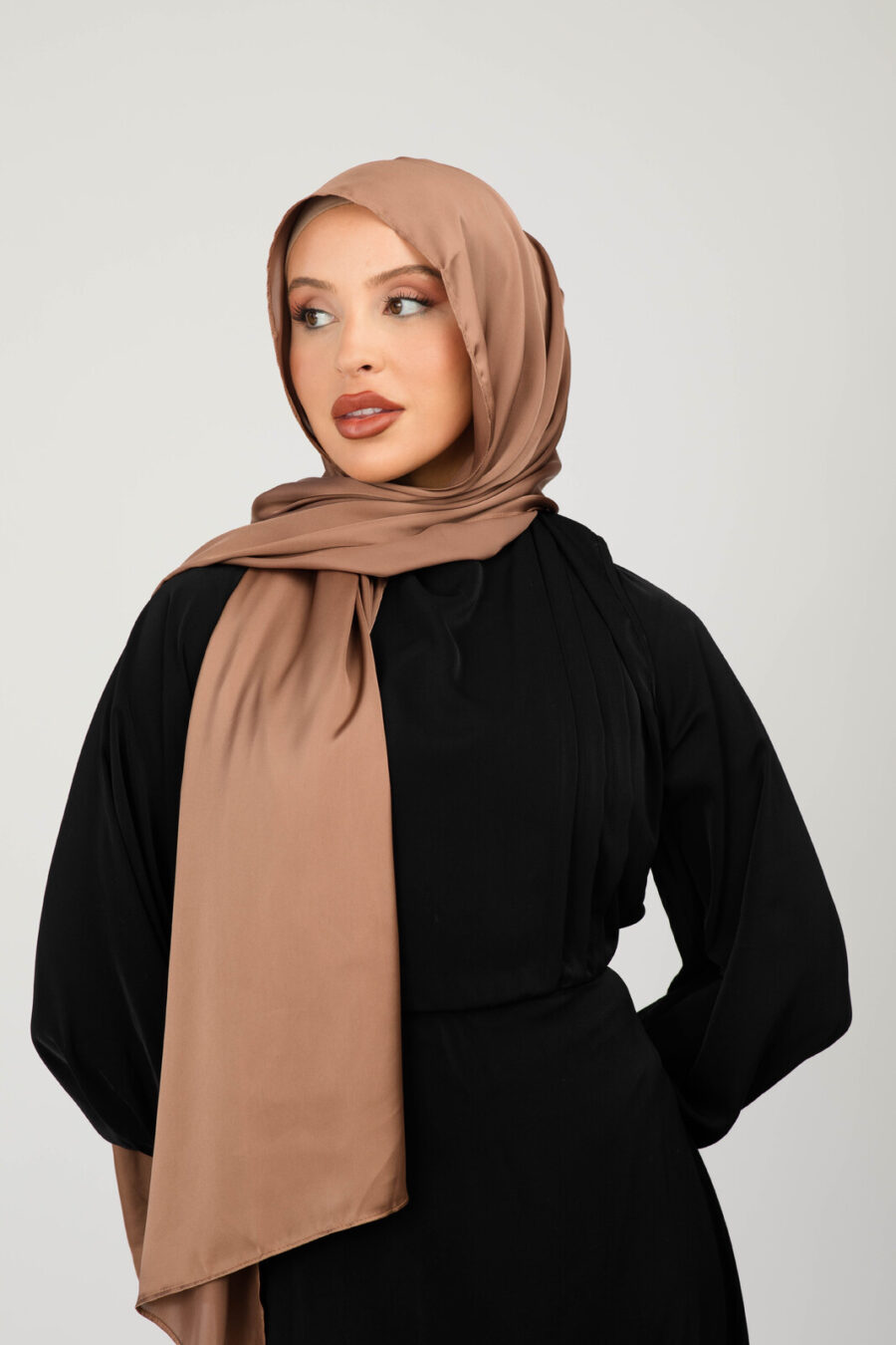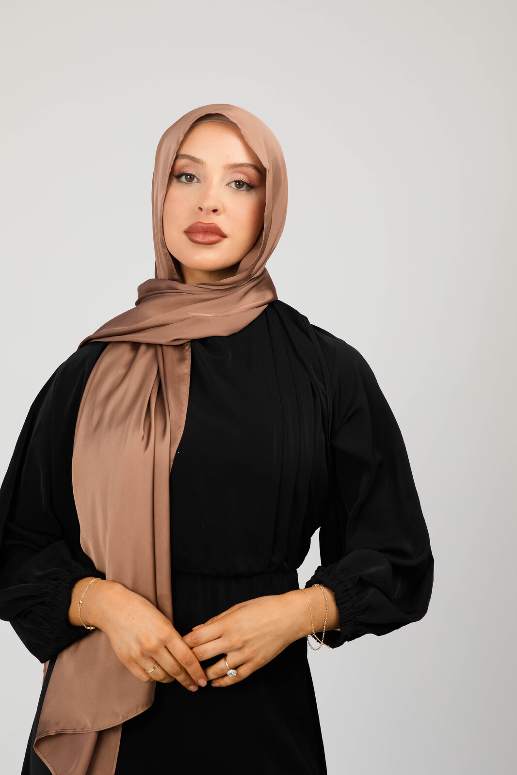 Elevate any special occasion with our must-have Luxurious Silk Hijab. Hand-stitched for quality, its perfect drape enhances your natural beauty, making a stylish statement in Honey Brown.