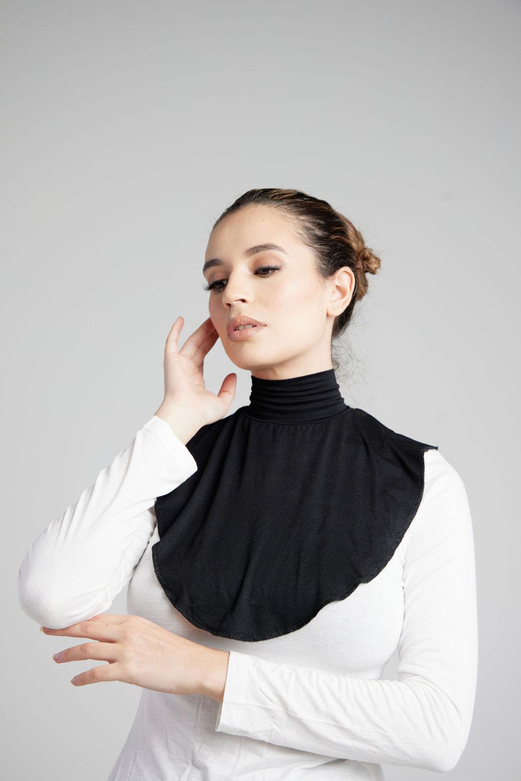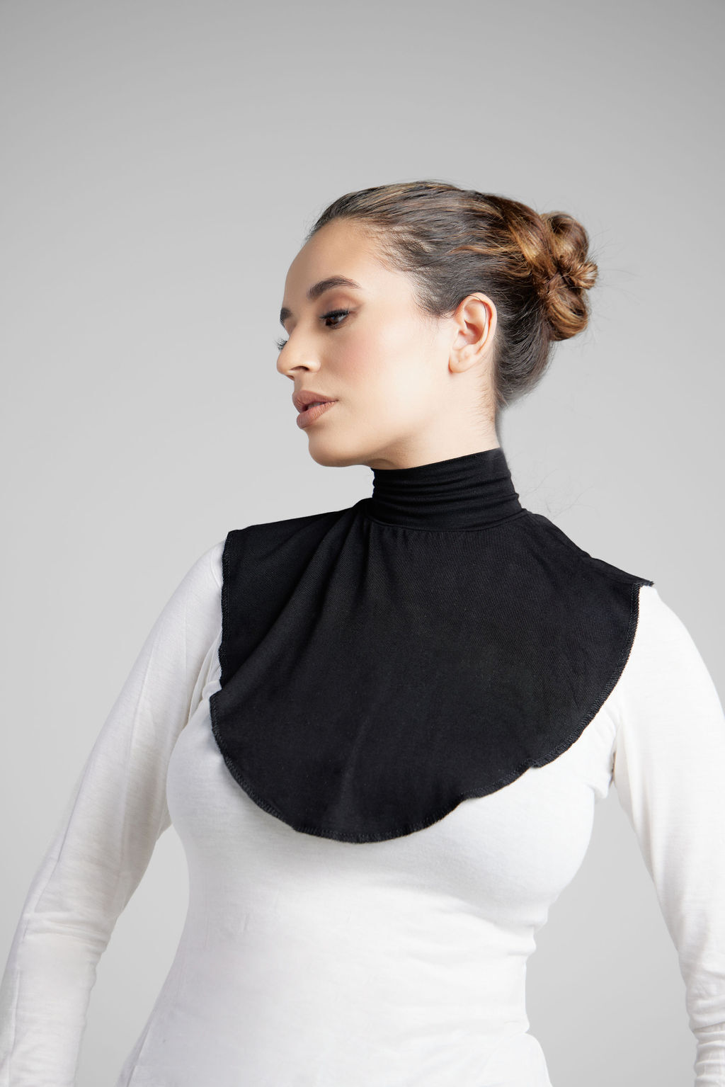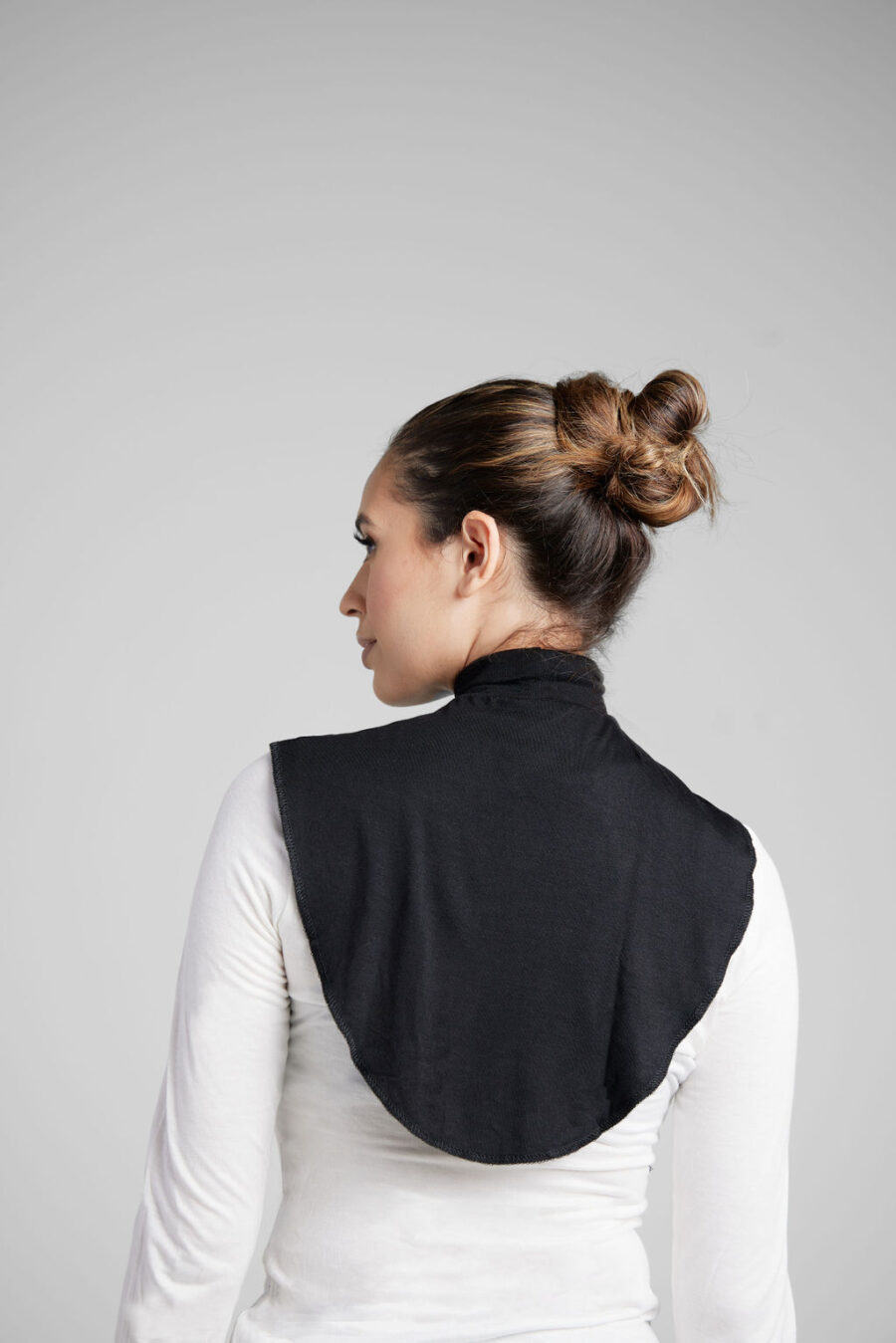 Soft and made from cotton jersey, this neck cover ensures maximum coverage. Designed for open-style tops, it’s worn by slipping over the head, providing shirt-like coverage without sacrificing a stylish look.